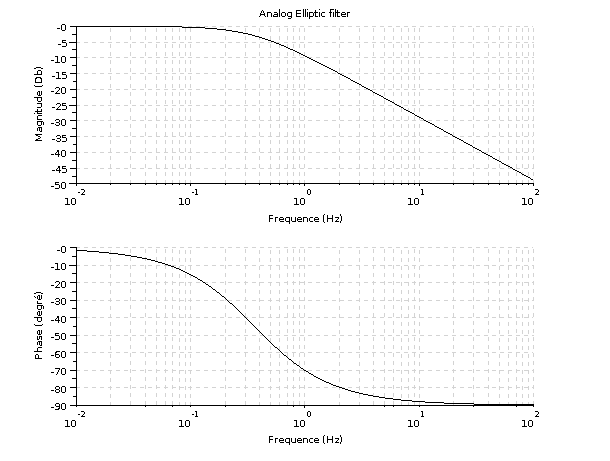 There are several possibilities to design an elliptic lowpass filter. We can use analpf or zpell. We will use zpell to produce the poles and zeros of the filter. Once we have got these poles and zeros, we will have to translate this representation into a syslin one.
